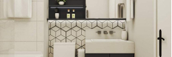 Черные акценты помогут зонировать пространство, сделать эффектным. Можно ограничиться укладкой светлой плитки на стенах, а темной — на полу, или пойти другим путем. Интересно смотрятся вставки из кафеля с рисунком, комбинация контрастных элементов в форме сот. Тонкая окантовка из черного керамогранита создаст впечатление лаконичности и элегантности.